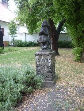 Vasárnap reggel indultunk, meglepően időben. Így 10re, zuhogó esőben Kecskeméten voltunk a Szórakaténusz játszóházban. A múzeum kertjébe belépve az első, amivel találkoztunk ez a szobor volt: