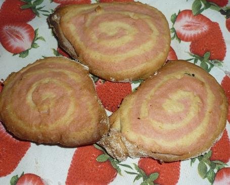 A porcukrot és a vajat habosra kell keverni, majd mehet hozzá a reszelt citromhéj, a liszt és a tej. (Mi a citromlevét is beletettük és én a liszthez odacsempésztem egy tasak főzős-vaniliás pudingport is) Jó alaposan össze kell gyúrni, kidolgozni, majd kétfelé kell osztani. Az egyik felét meg kell színezni az ételfestékkel vagy a szörppel. Mindkét masszát fóliába tekerve a hütőben kell pihentetni különben a vajtól nagyon ragad. Ez kb. fél óra. Utána először a fehér tésztát kell vékonyra kinyújtani (a recept szerint kb. 3 mm, Kinga kritikus volt és szerinte én nem annyira nyújtottam), majd a rózsaszínt is és a rószaszínt rá kell ügyeskedni a fehér tetejére. Mi úgy csináltuk, hogy sütőpapíron nyújtottuk ki mindkettőt és akkor csak rá kellett borítani a rózsaszínt a világosra. Feltekerni, majd megint kis hütő pihi, sütő előmelegít… A pihentett tekercset 5 mm-es szeletekre kellett vágni (azt hiszem, itt megint elbuktam és nem lett pont 5 mm-es) és forró sütőben megsütni.