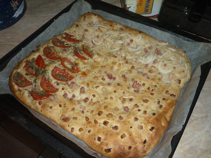 1 dl olajat, tejet, 0,5 kg lisztet, 1 ek. cukrot, élesztőport, 1 ek. sót bedagasztottam a kenyérsütőgépben, majd hagytam még kelni. Olajos kézzel tepsibe nyújtottam, tetejére bacont szórtam és sütőbe vele…